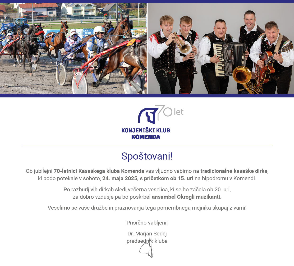 Vabilo na kasaške dirke in veselico v Komendi 24. maja 2025